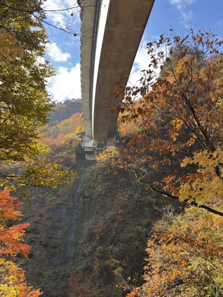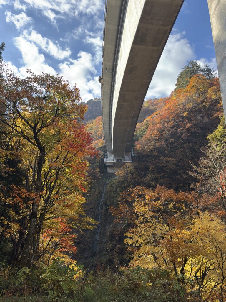 眼下には穏やかに流れる川、周囲を囲む山々は今ちょうど紅葉のピーク🍂